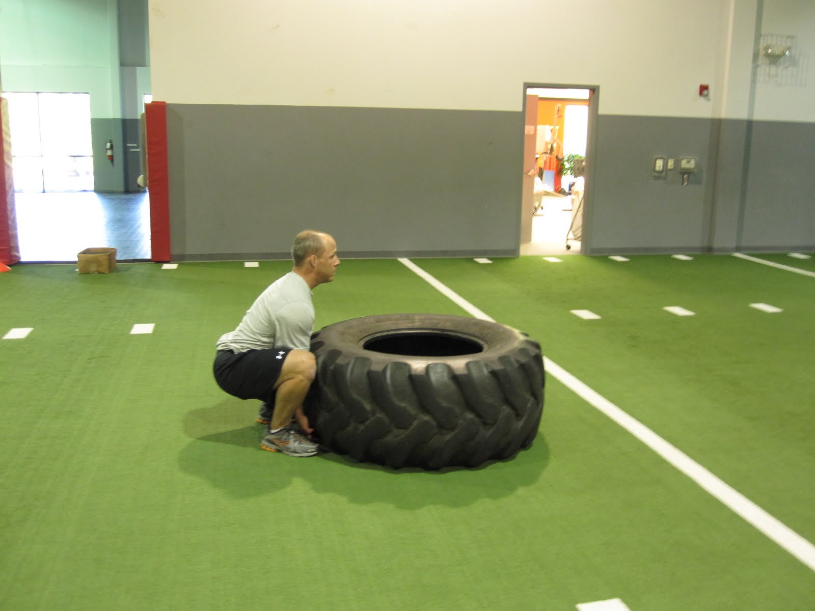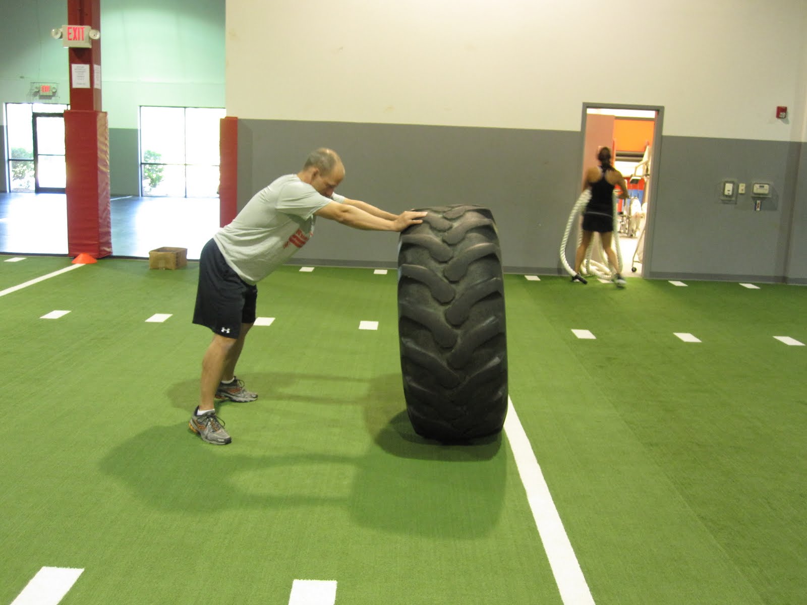 Again, if running isn’t your thing, well, I have almost eight months of training schedules to choose from here. Pick one and get started. If you haven’t noticed, I have a google search function at the bottom of the page so that you can search my blog for different exercises and training schedules. For example, tire flips. Here is a picture of Jason Davidson, my fellow weightlifting coach, demonstrating a tire flip with one of the lighter tires over at the Athletic Performance Center.