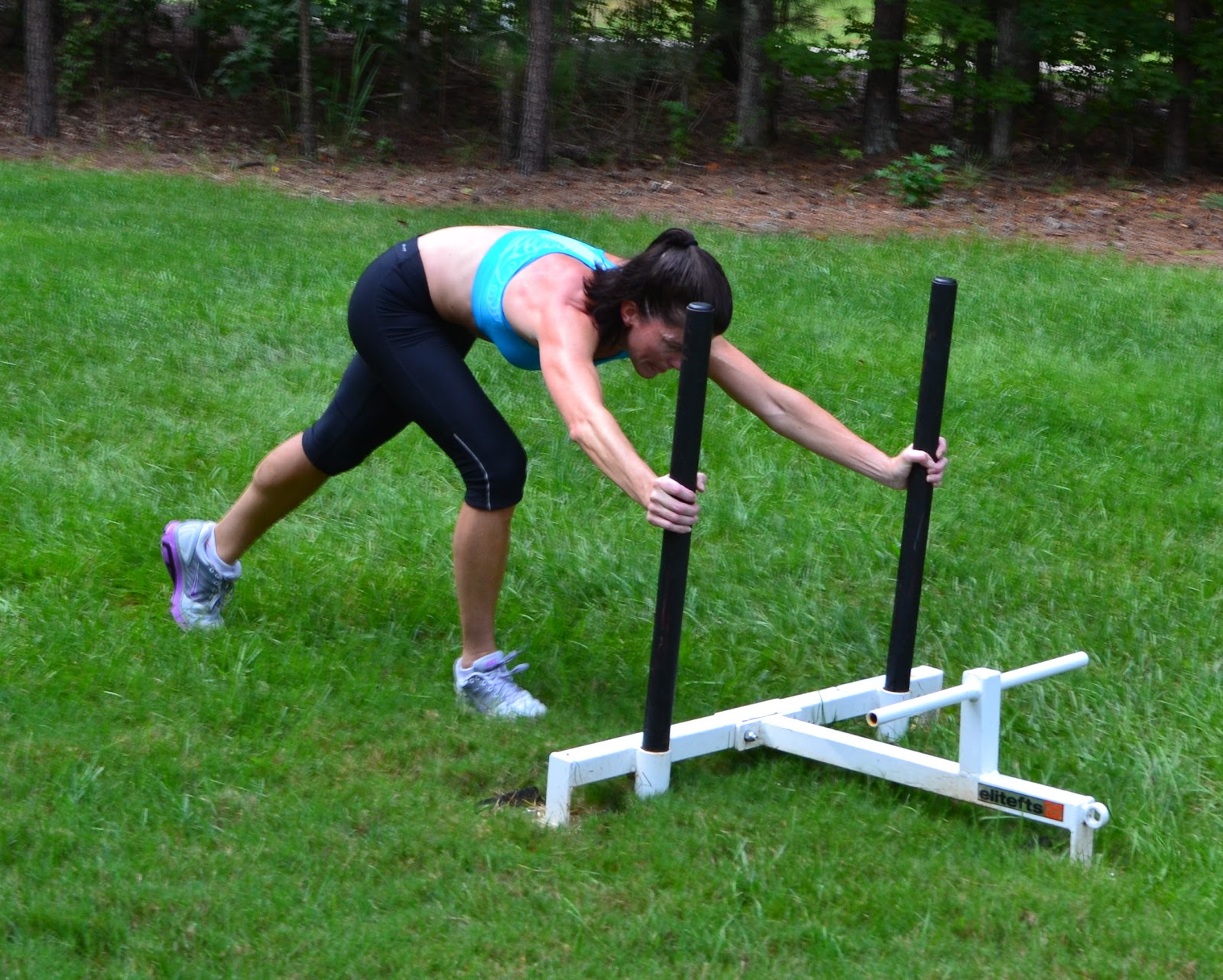 The second station is the prowler. We’ll probably be repeating this one a lot. The prowler is both a wonderful and horrible thing to play with. This past weekend, we used it without any added weight, running if we could. The prowler requires you to push with your entire body. The effort is similar to what it will feel like climbing out of a mud trench or trying to get up a steep hill. The “Everest” obstacle, a half pipe that you have to run up in hopes of catching hold of some helpful person’s hand will require a burst of speed and power towards the end of the race. Working with the prowler will help build this higher intensity endurance and strength both for general race endurance as well as the more strenuous parts of the course.