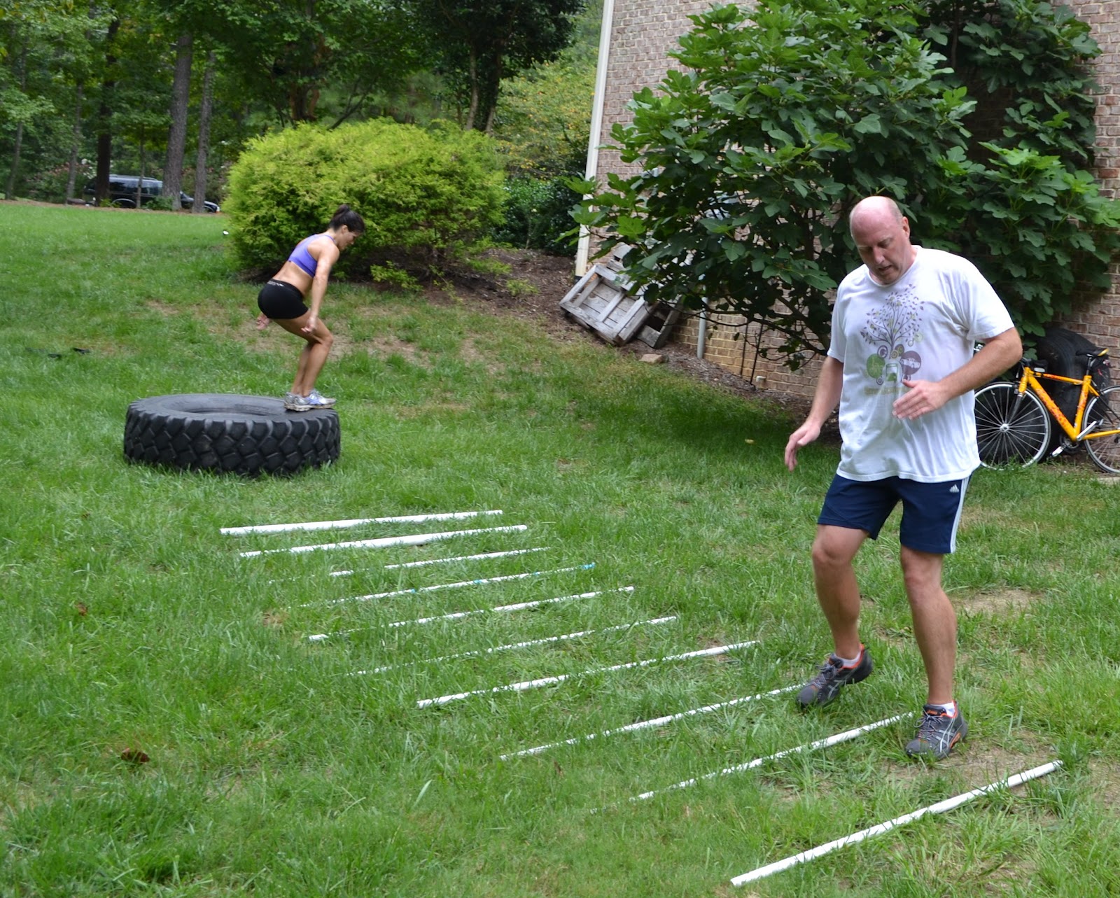 The third station on Saturday was a combination of what will become two stations eventually, Agility and Balance, which were done as a circuit. Agility and balance are crucial to safety on the course. Agility training is typically used as speed drills for sports, but the main goal is strengthening of the joints in multiple directions and good kinesthetic awareness and proprioreception. These last two big terms simply mean one’s ability to sense where one’s body is in space and respond quickly to one’s environment. For these we had a big tire and some pipes set up as an agility ladder. The tire we used to jump onto and off of from both a forward and sideways direction. The point was not to do this for conditioning or speed, but to jump and land solidly with good balance. We also ran through the agility ladder both forward and sideways. A good number of injuries occur simply from not securing a good landing or instability in the ankles, knees, or hips when stepping out of your plane of movement. A little prevention goes a long way.