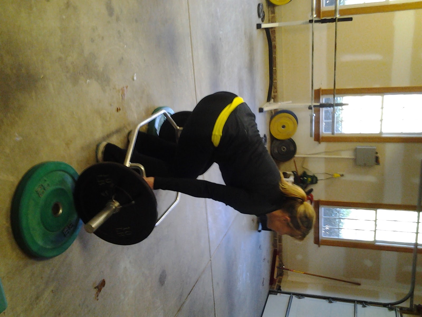 | At the start of this lift, Stephanie is able to lift with the center of gravity of the bar close to her own whereas a traditional barbell pitches her forward. |