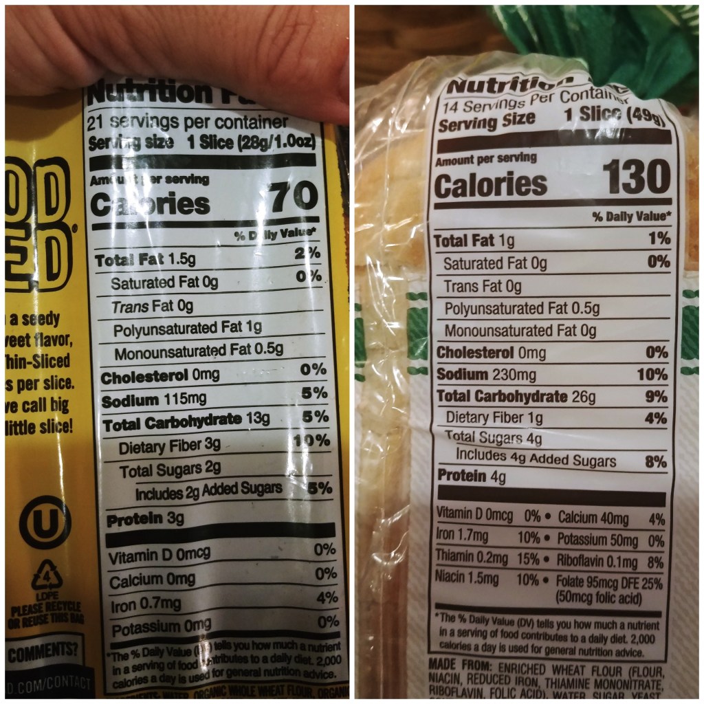 This morning I wanted a BLT. I found some thick sliced bacon in the freezer, a nice big tomato, and some lettuce that I’ve been growing on the back porch. When it came to choosing the bread, however, I have two choices. I can use the Pepperidge Farm Farmhouse White bread that I get for my kids (because they are growing athletes who need a lot of calories) or I can use the thin sliced Dave’s Good Seed bread. Take a look at the difference in the nutrition information: